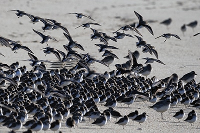 À marée basse, la vasière de Saint-Armel s’anime : des centaines d’oiseaux venus du nord de l’Europe viennent s’y nourrir.